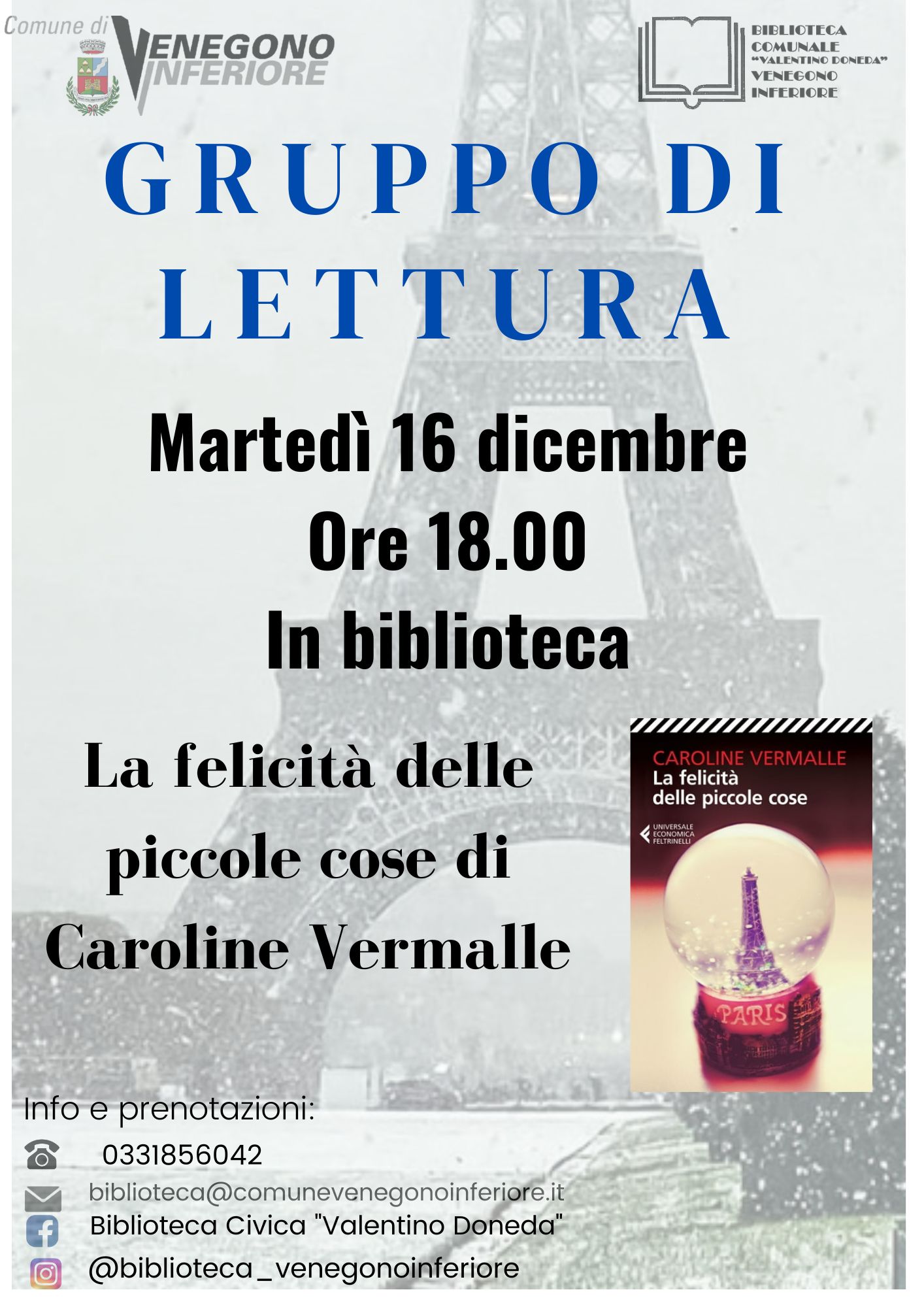 Martedì 16 dicembre alle ore 18.00 il gruppo di lettura si incontra per parlare del libro "La felicità delle piccole cose" di Carolina Vermalle.
