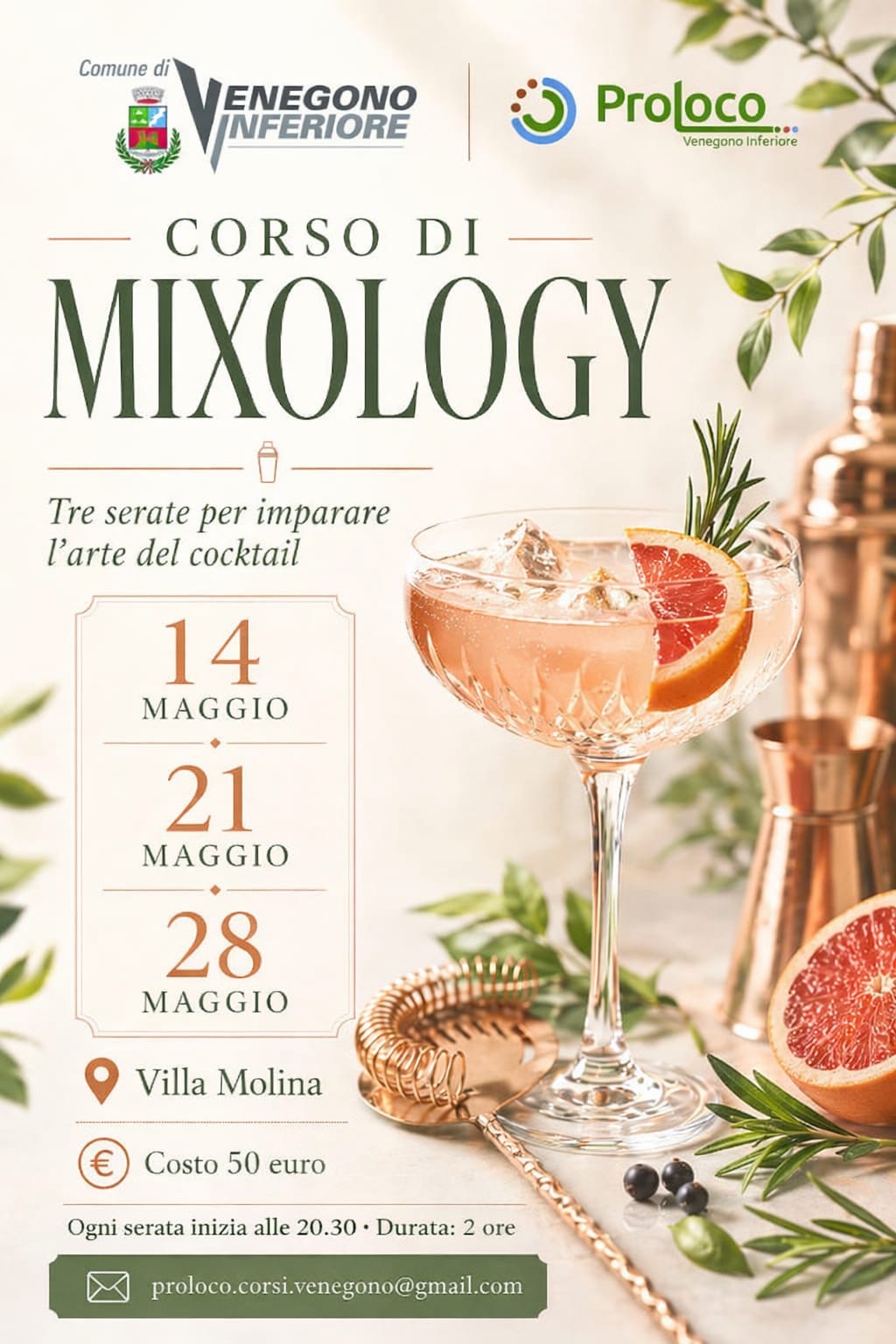 Corso di Mixology presso Villa Molina, organizzato da ProLoco con il patrocinio del Comune di Venegono Inferiore, a partire da giovedì 14 maggio e articolato in 3 serate, dedicato alla scoperta e creazione di cocktail in un contesto conviviale e di socialità.